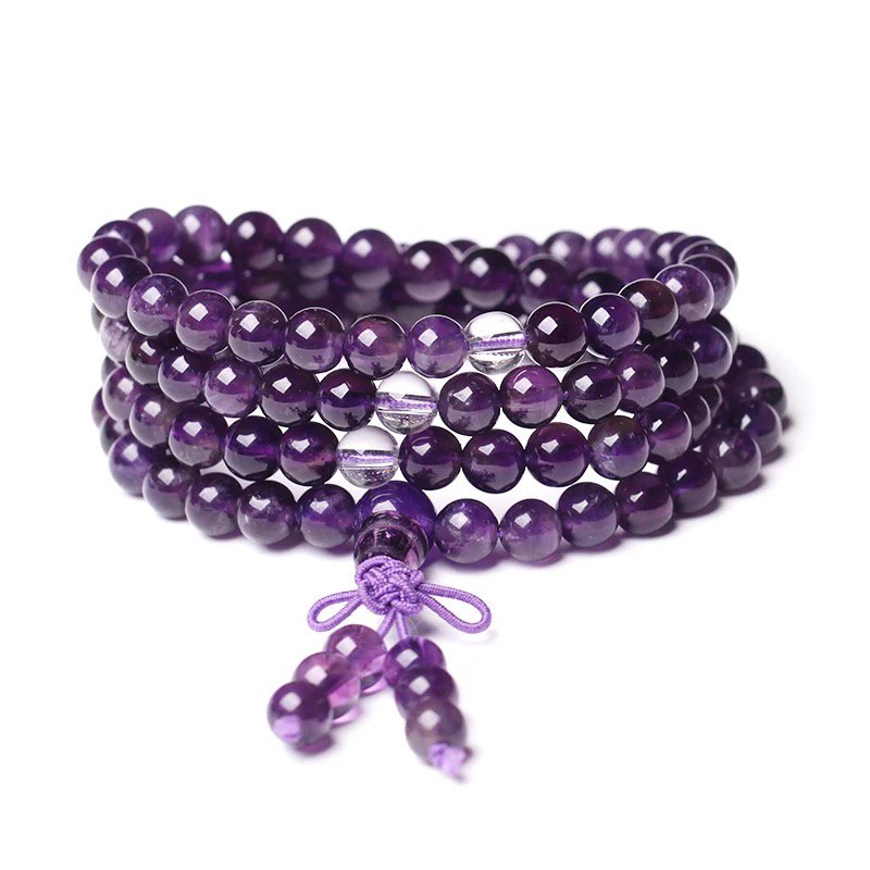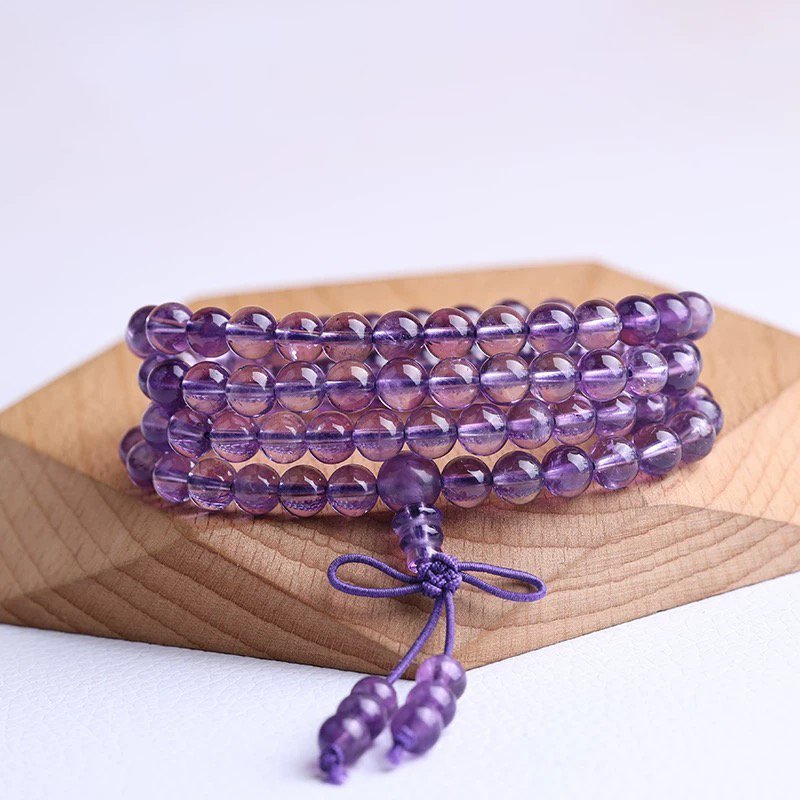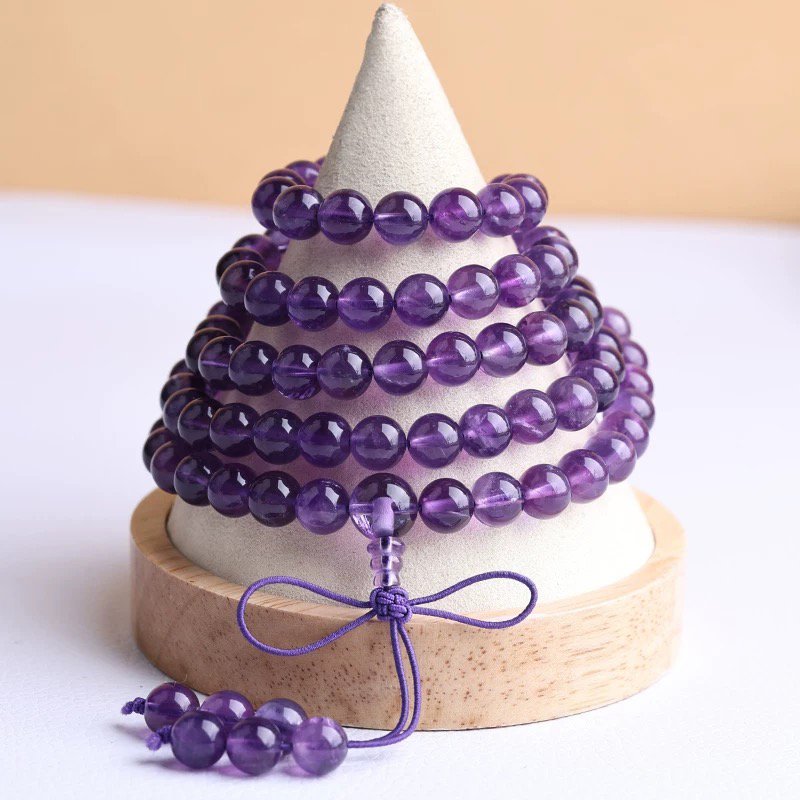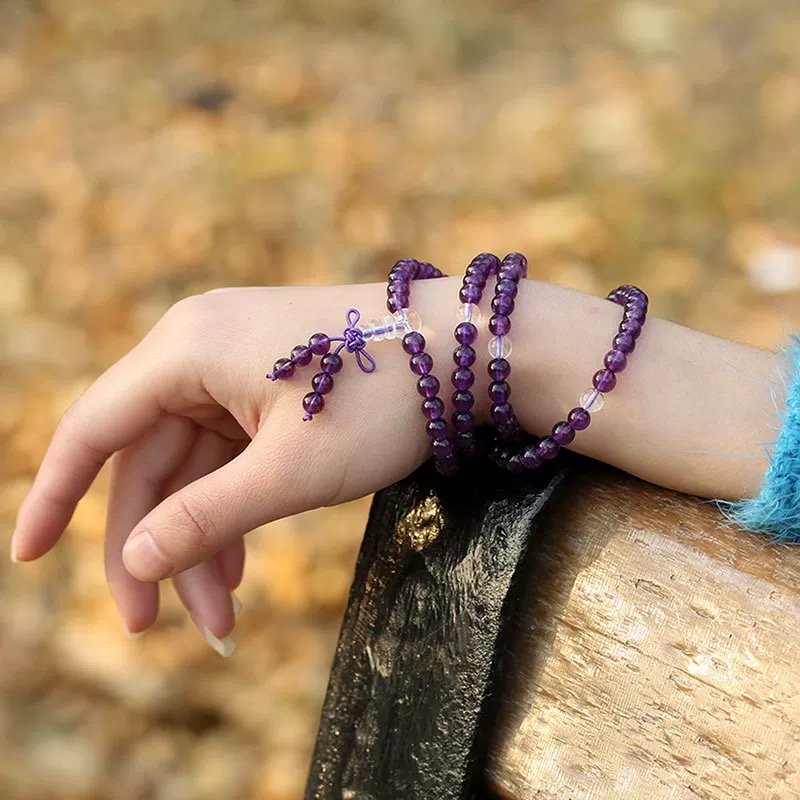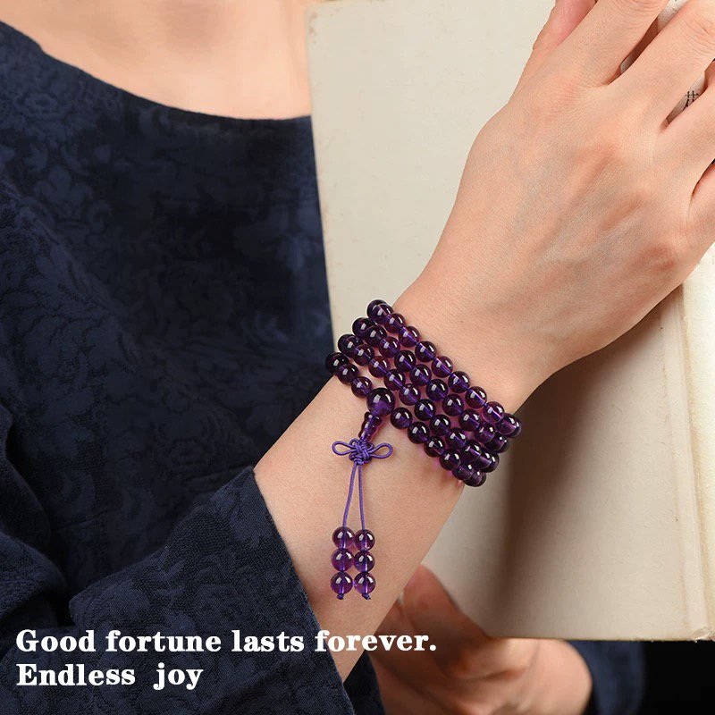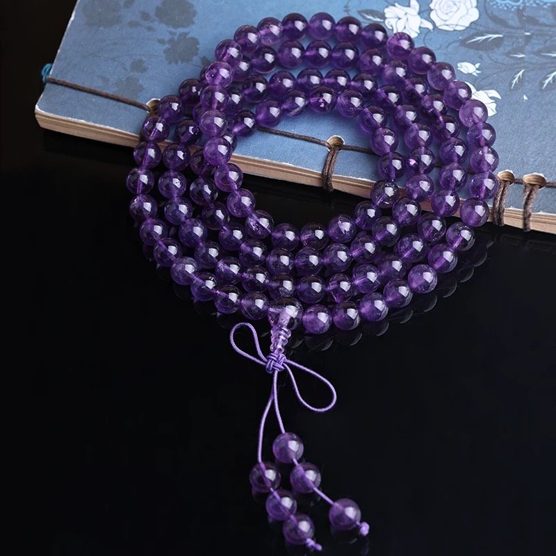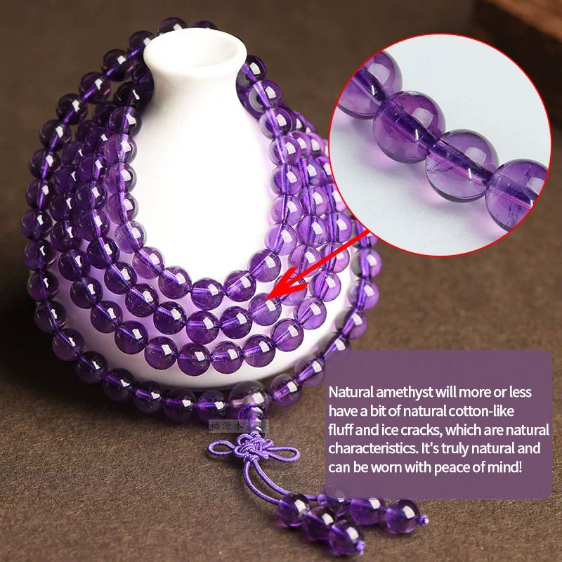 この天然ブラジル紫水晶の 108 粒仏珠は、ビーズが 1 つ 1 つきらきらと透明で、神秘的な紫の光を放っています。伝説によると、水晶は神様が降らせた星の破片で、紫水晶はさらに知恵と霊性の象徴と見なされています 。108 粒の仏珠は百八の煩悩を断つことを意味します。これを身につけると、気場を整え、雑念を追い払い、生活の中で煩悩から遠ざかり、知恵を開き、安寧と福を手に入れるように助けます